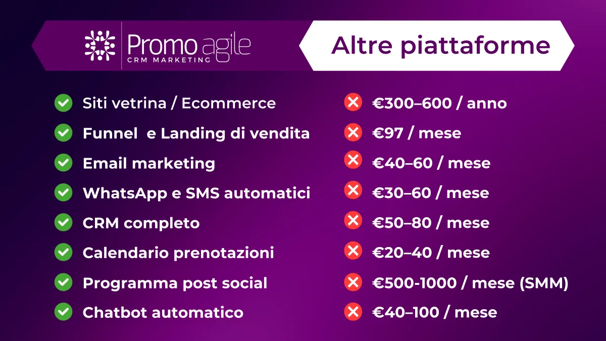 CRM. Siti. Funnel. Calendari. Email. SMS. Whatsapp. Social. Area clienti. Pagamenti. Automazioni. Tutto incluso.